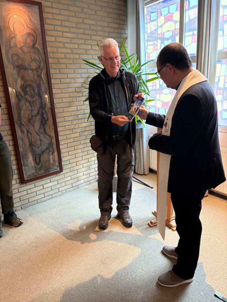 Overhandiging door Fokke van Dalen (co-auteur) van de wandelgids aan pastoor Ton Huitink van de parochie Thomas a Kempis in Zwolle-Zuid (foto MJ okt’25)