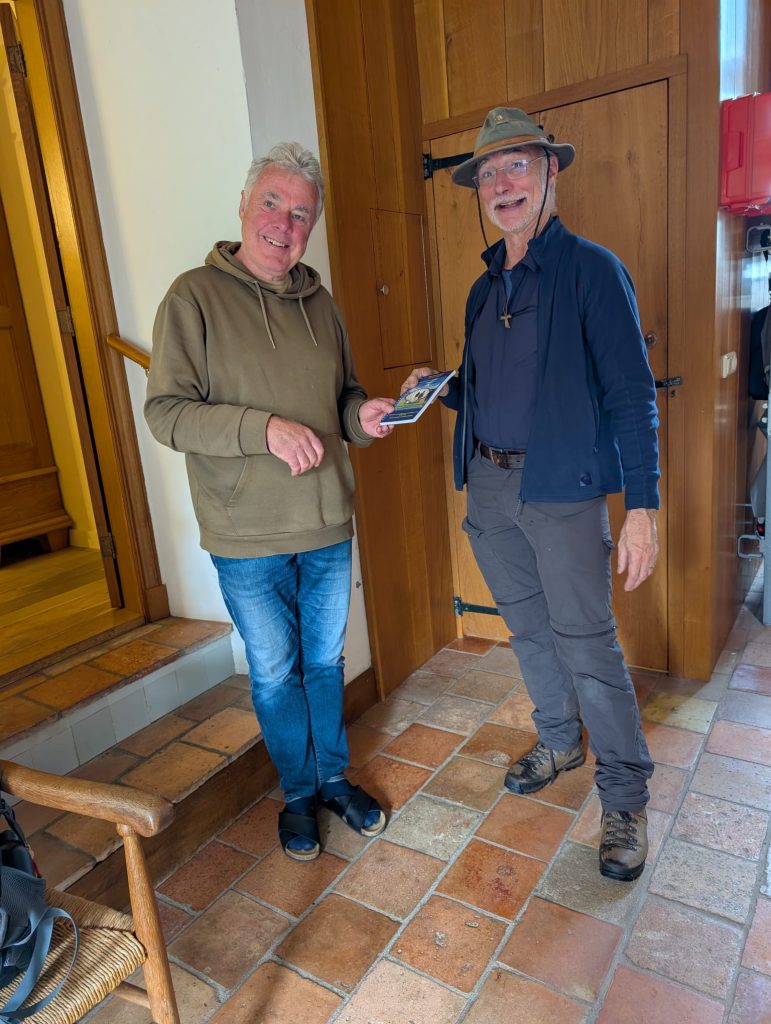 Overhandiging door Michael Buykx (co-auteur) van de wandelgids aan de koster de hr. Verweij van de Hervormde kerk in Windesheim – tevens stempelpost op de route (foto FvD okt’25)